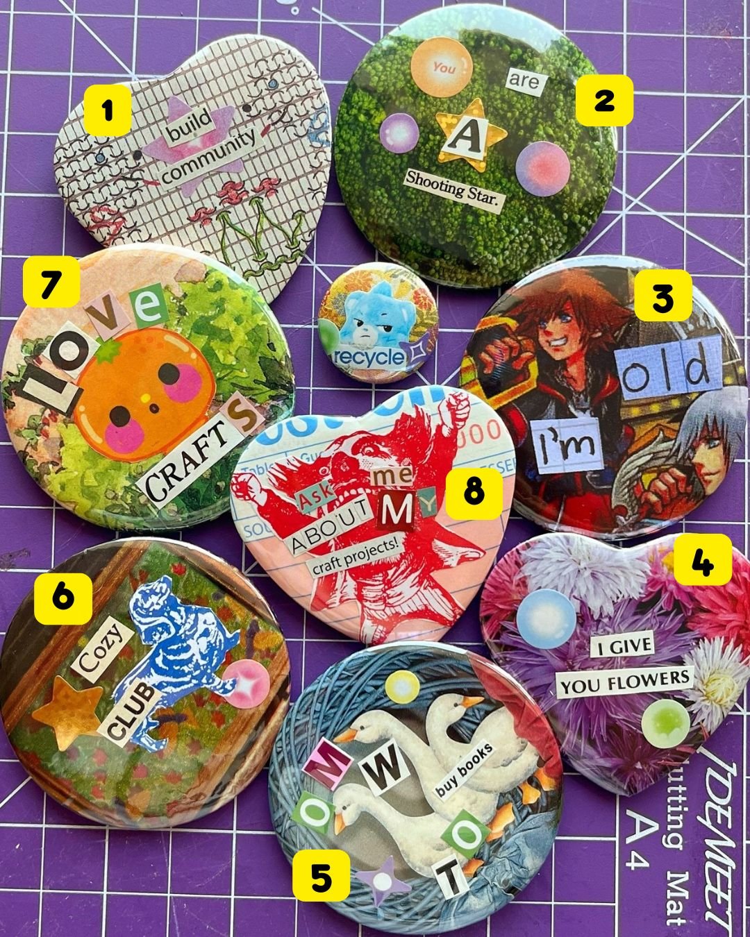 Silly **one of a kind** buttons made from magazine scraps and cute stickers. About 2.3 inches each. Order more than one for a special discount ;)